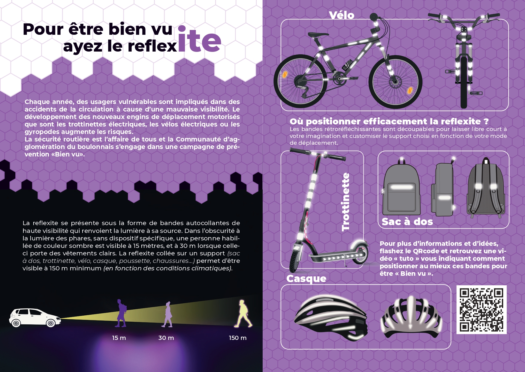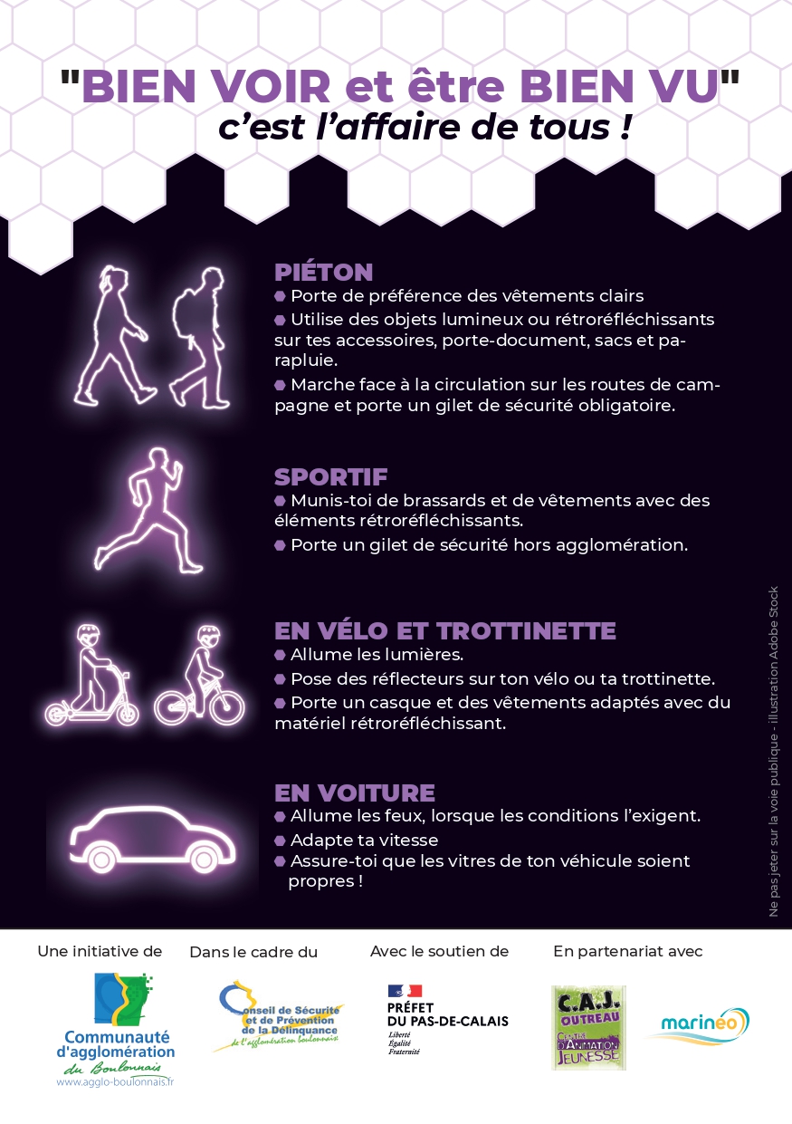 Bonjour à tous, La Communauté d’Agglomération du Boulonnais avec son réseau de transport urbain Marinéo se mobilise ensemble pour sensibiliser à la prévention et la sécurité sur la visibilité « à pied » des habitants du boulonnais dans le cadre de la campagne « BIEN VU» et serons présents ce lundi 24 novembre de 17H00 à 19H00 en Station Liane (gare routière à Boulogne-sur-Mer). La période hivernale se traduit par des journées de plus en plus courtes avec une luminosité réduite et se révèle un facteur de risque et de danger sur la route pour les automobilistes et les piétons. En effet, le passage à l’heure d’hiver provoque un pic d’accidentalité sur les routes avec des accidents de piétons qui ont lieu en fin de journée expliqués notamment par la mauvaise visibilité. Le développement des nouveaux engins de déplacement motorisés que sont les trottinettes électriques, les vélos électriques ou les gyropodes augmente aussi les risques. C’est en ce sens que les équipes de la Communauté d’Agglomération du Boulonnais et Marinéo seront présents à la montée des usagers dans les bus et habitants du boulonnais plus largement afin de les sensibiliser aux risques encourus lors des déplacements par faible luminosité sans dispositifs de signalement et de visibilité. Sans aucun équipement rétro réfléchissant, les piétons ne sont visibles qu'à 15 mètres* par un automobiliste, alors qu'ils sont visibles à plus de 150 mètres lorsqu'ils en sont équipés. à Pour être bien vu, ayez le reflexite: à poser sur son vélo, sa trottinette, son sac à dos, son casque … plus qu’à choisir son équipement😊 ! On vous attend nombreux pour véhiculer l’importance d’être BIEN VU et vous équiper pour la période hivernale de ces dispositifs.
